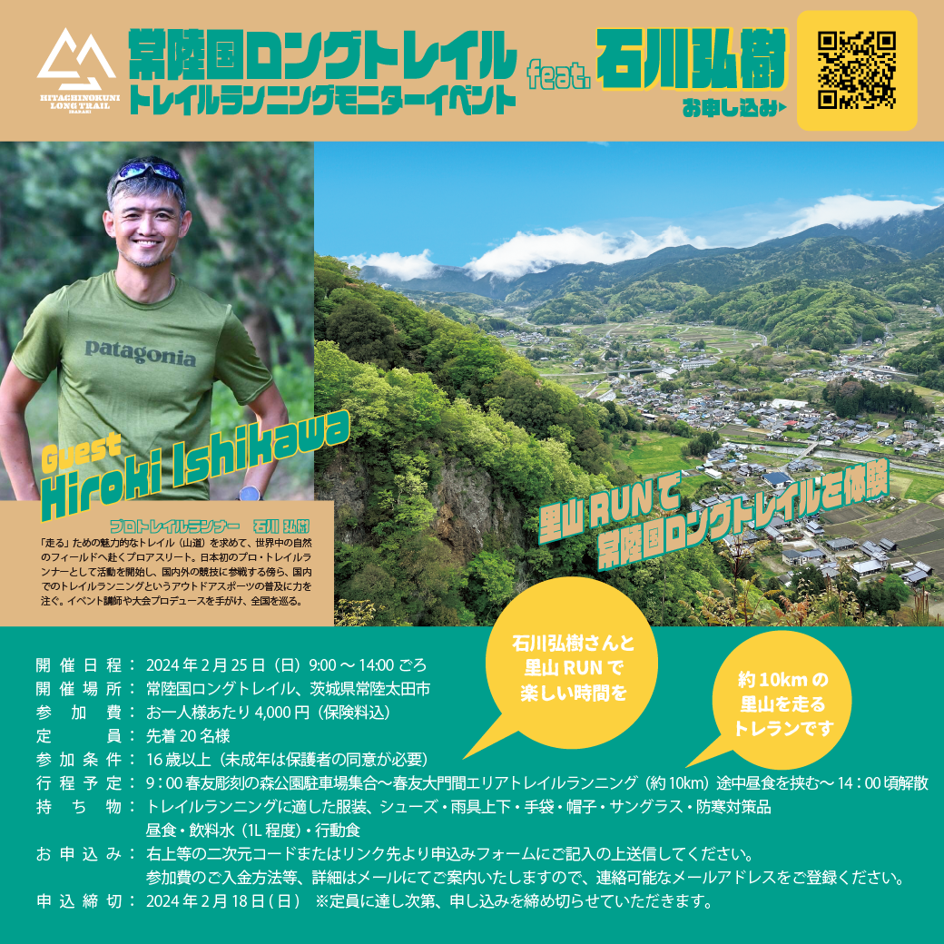 Professional trail runner Hiroki Ishikawa, who is also a leading figure in spreading trail running in Japan, will be our guest and we will run together in the satoyama of the Hitachi-no-Kuni Long Trail.