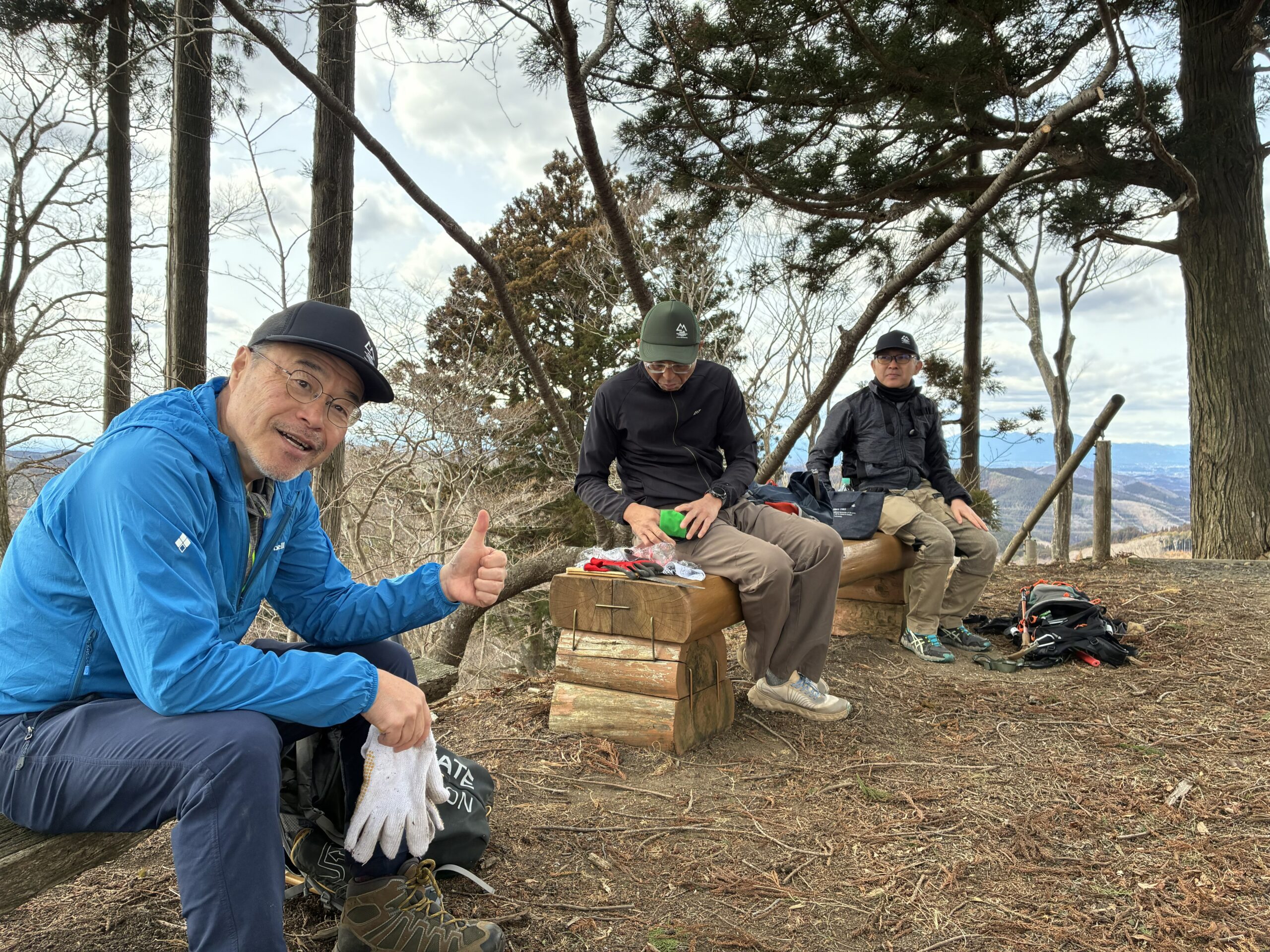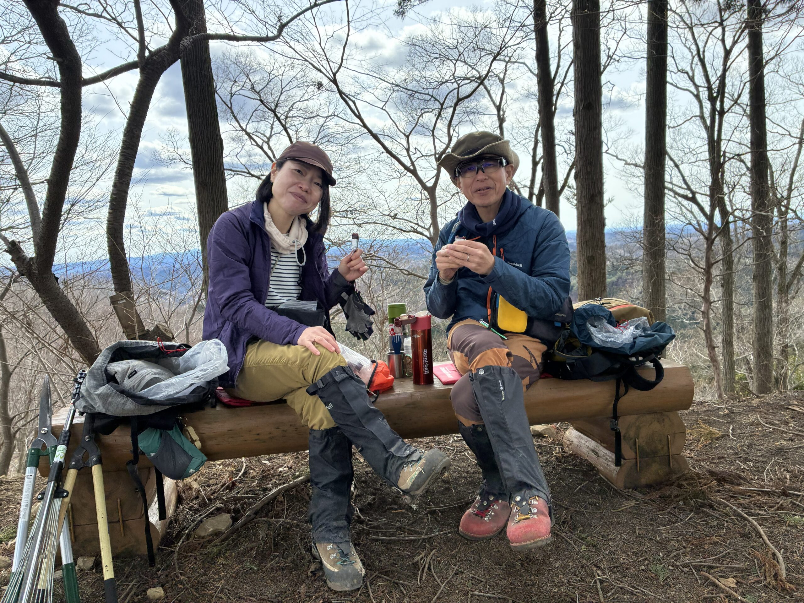| 尺丈山頂です。北に那須と八溝、西に高原山と日光、南には筑波、東には高鈴や奥久慈男体山。約200㎞先の富士山は春霞でダメでした。 | さ、お昼ごはん。山頂エリアはベンチもたくさんあって、おもいおもいの場所でランチです。 |