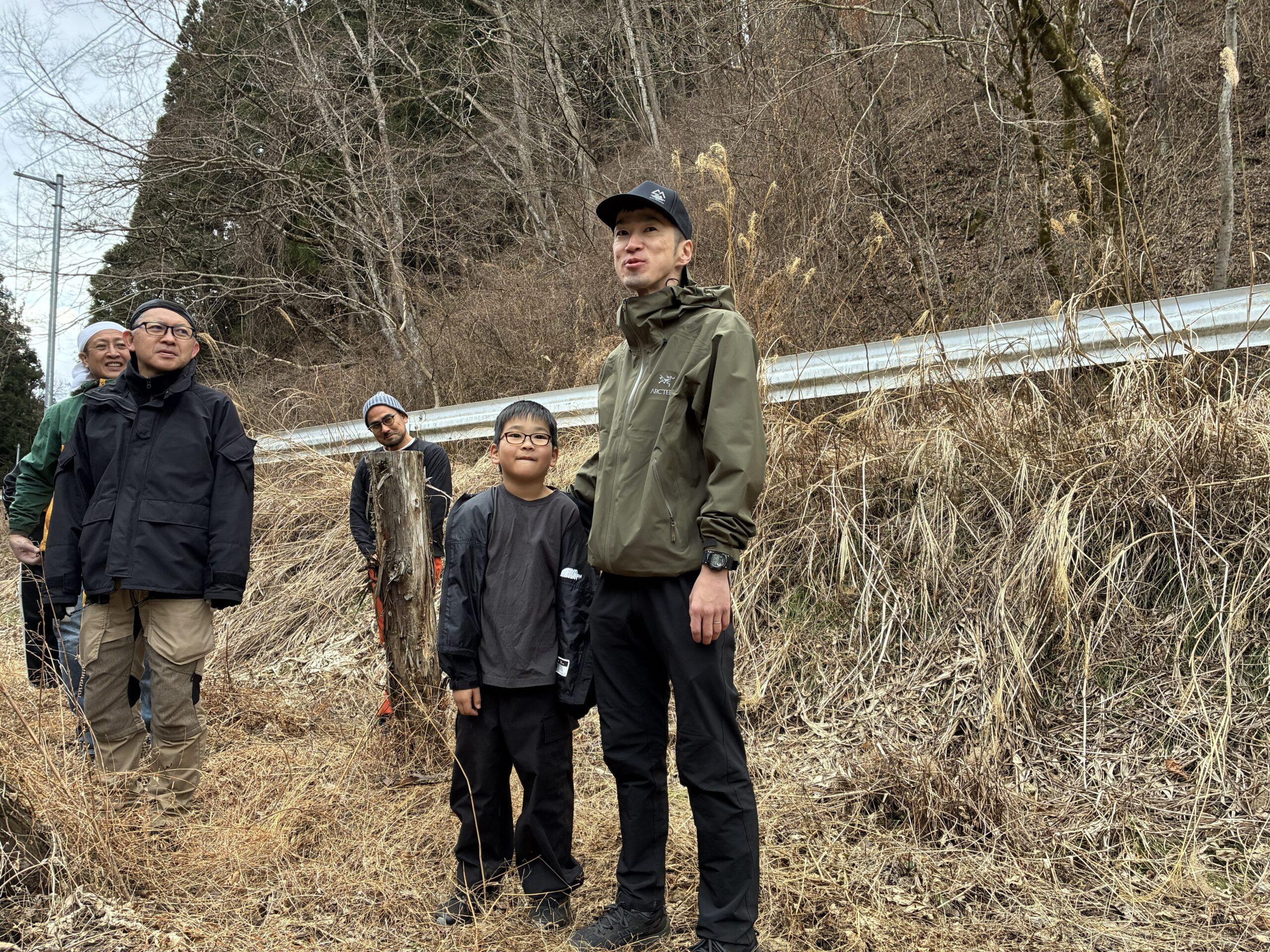 | 総勢35名、いざ出陣です。刈払機、チェーンソー、剪定バサミ、熊手など武器も充実です。 | なんと小学1年生が参加! 後ろはお父さんではなくリーダーの若井さんですね。 |