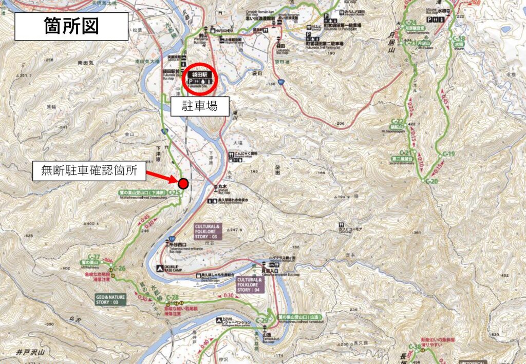 最近では中央部(C)コースの鷲の巣山登山口(下津原)で、周辺住民の方が所有する土地に、繰り返し無断駐車がなされていることが確認されています。